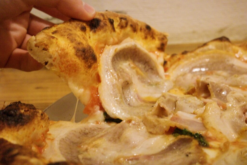瑞々しいトマトソースで潤う香ばしく焼かれた極薄の生地を舌に乗せた途端、ポルケッタの脂が熱で蕩け、ソースと一体となっていく。